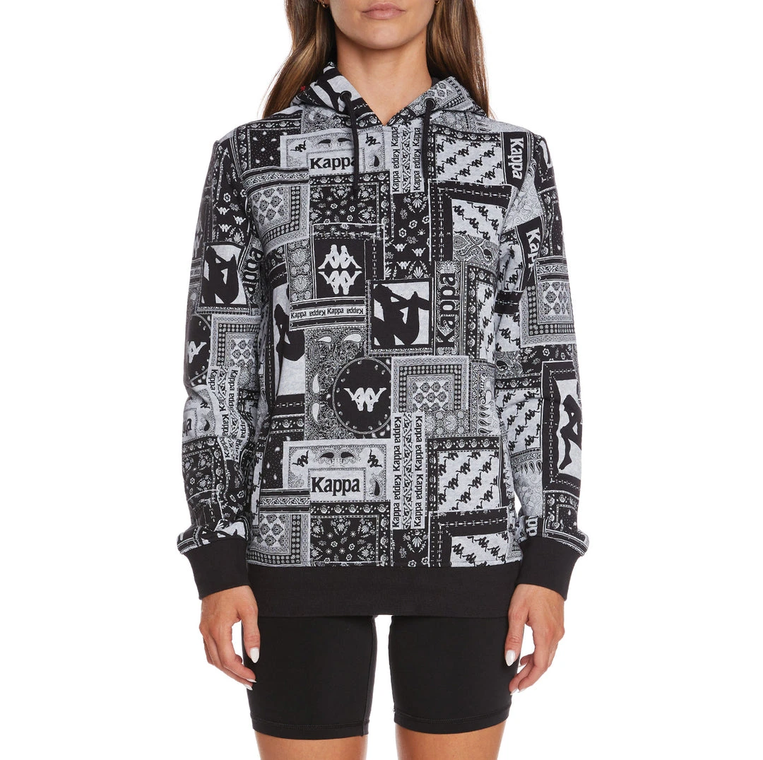 Womens fleece hoodie. REGULAR FIT. Graphic all-over printed, ribbed borders. Textile Composition: Cotton 80%, Polyester 20%.