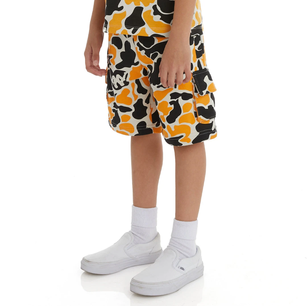 Kids bermuda in french terry. REGULAR FIT. Side pockets, back zipped pocket. Logo printed on side, all over print. Textile Composition: Cotton 80% – Polyester 20%